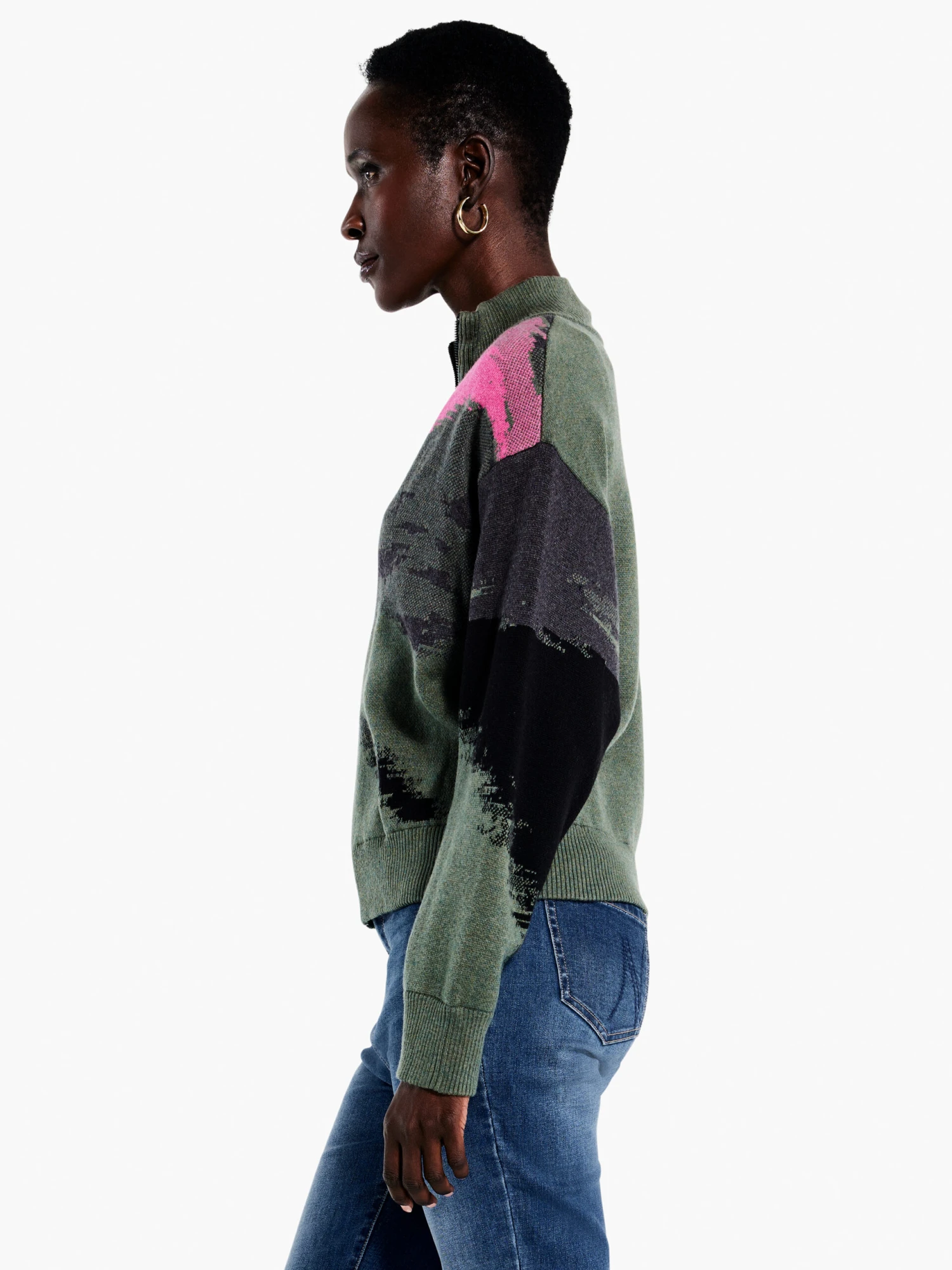 How to make the most of those grey sweater days? Just add a pop of pink. This fun, functional piece also boasts a sporty style to match its spontaneous streak of color thanks to the dropped shoulder easy fit, full zip closure, and stand collar. Perfect for adding something special to even the most casual of looks. Our knitwear geniuses blended the colors with an intarsia stitch for extra vivid contrast that lasts. Mindfully Made from more sustainably sourced cotton.